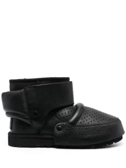 x Shayne Oliver Mini boots from UGG featuring black, calf leather, grained texture, ankle-length, faux-fur lining, debossed logo to the side, logo patch to the rear, perforated detailing, round toe and flat rubber sole.