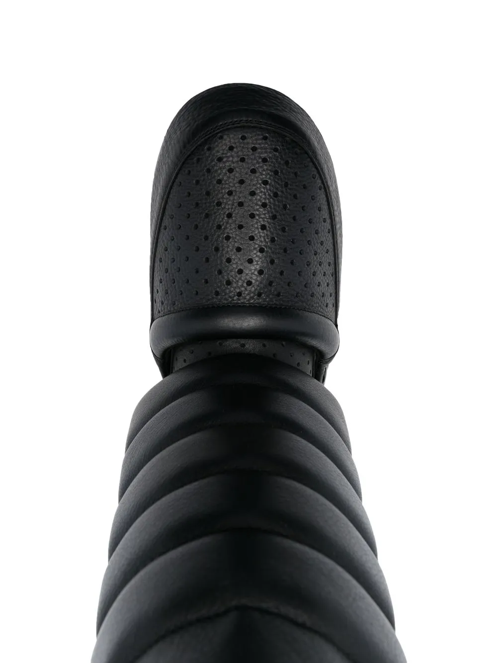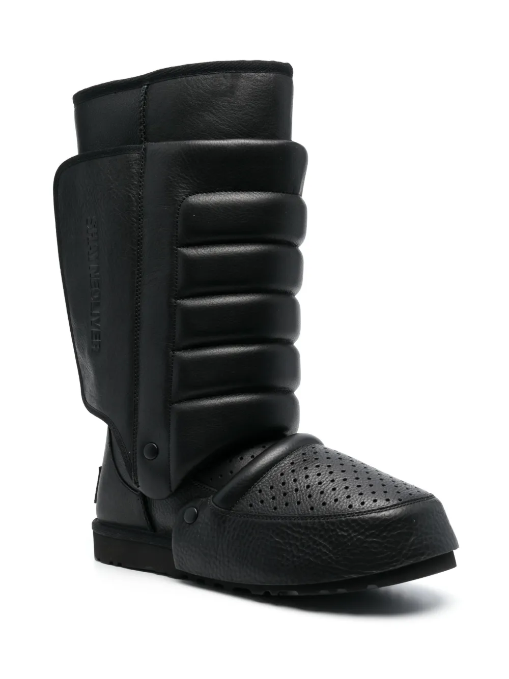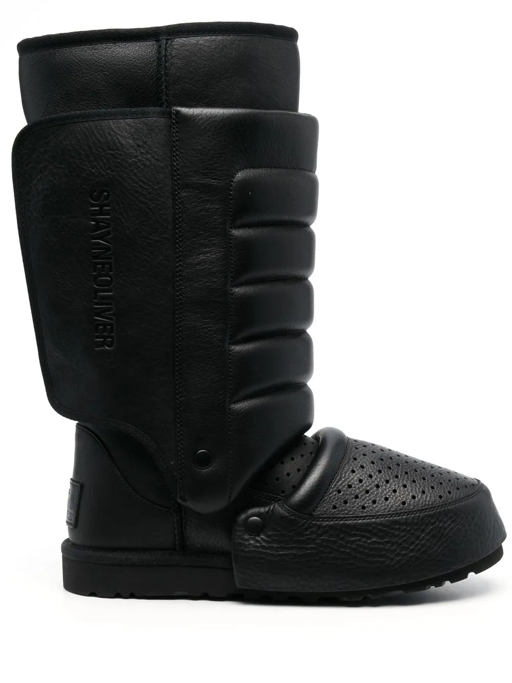 x Shayne Oliver Tall boots from UGG featuring black, leather, grained texture, logo patch to the rear, debossed logo to the side, perforated detailing, ribbed detailing, round toe, foam and flat rubber sole.