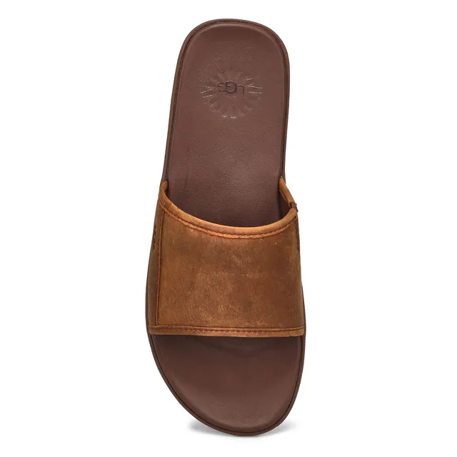 Cast in rich full-grain leather lined in super soft microfiber, the laidback Seaside luggage slide sandal from UGG Australia features easy elastic gore and a molded rubber outsole that travels virtually anywhere. Microfiber lining with a leather sockliner. Contoured EVA footbed for all day comfort. Pair with weekend shorts and jeans.