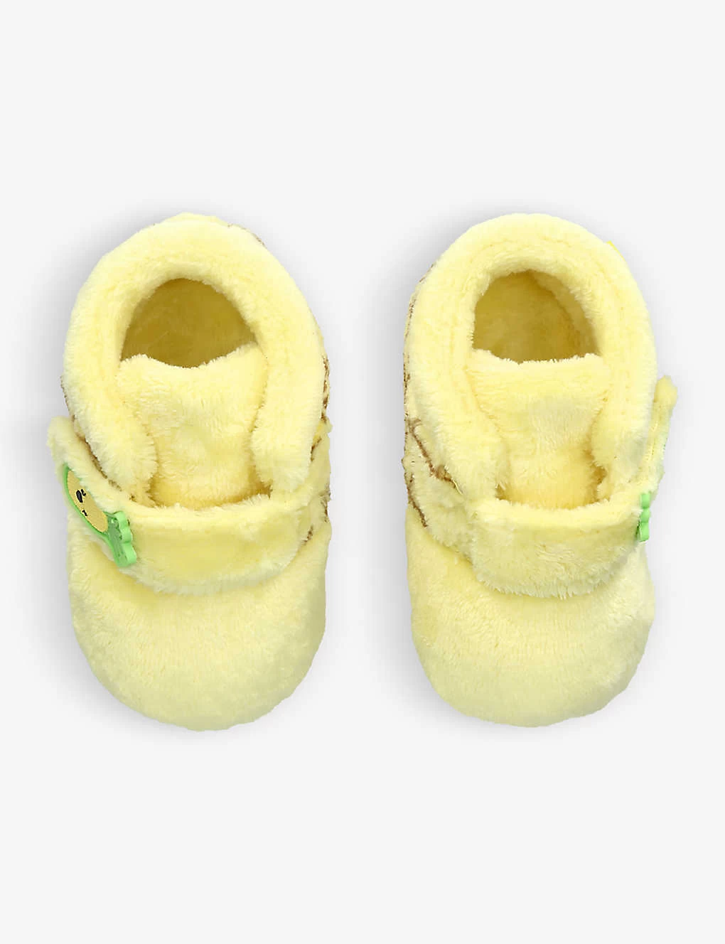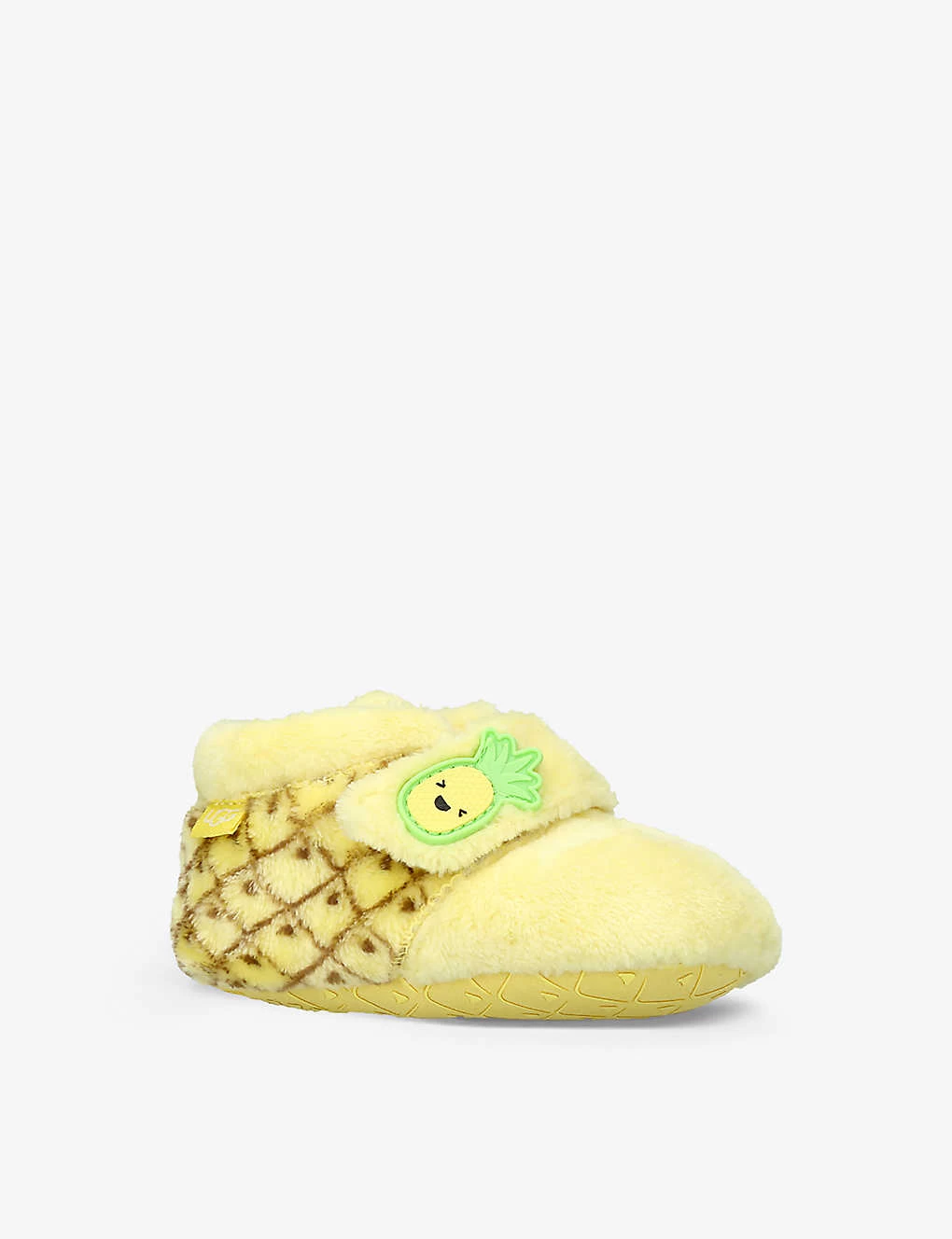 - Round toe, pineapple shaped tab, slip-resistant rubber print, all-over fleece pattern