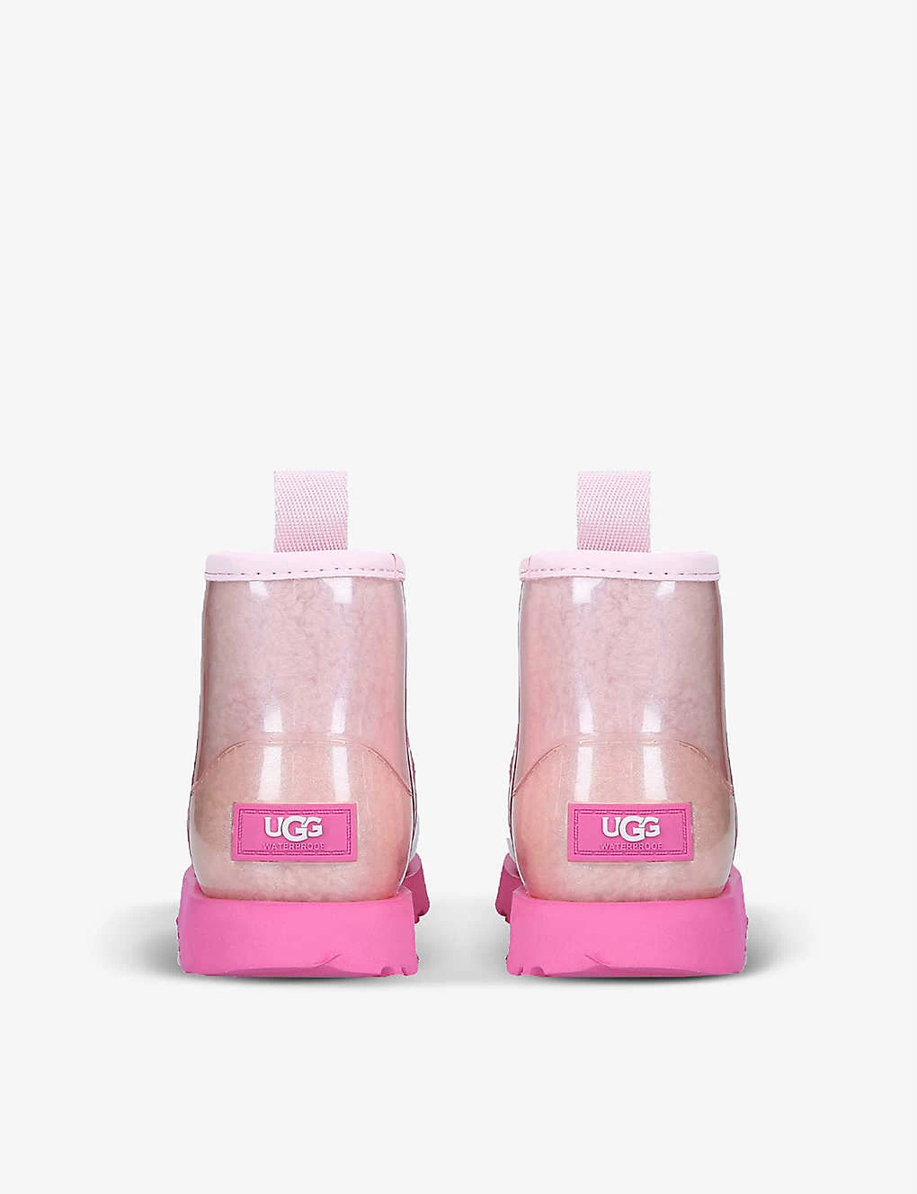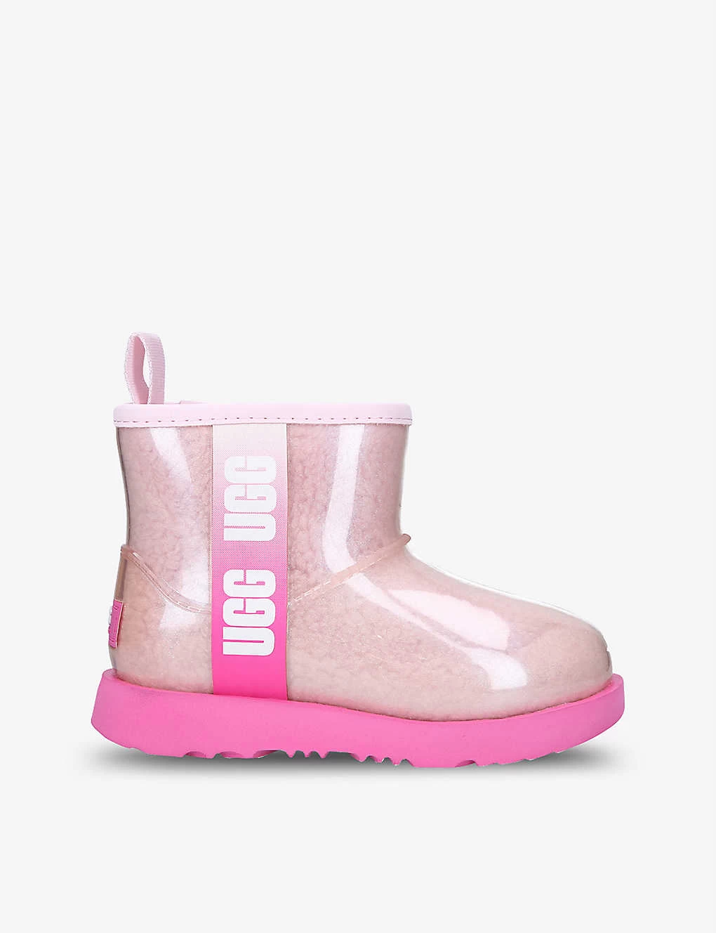 - Round toe, transparent upper, mid-top cuff, branded trim at side, pull tab at heel, faux-shearling lining, removeable insole