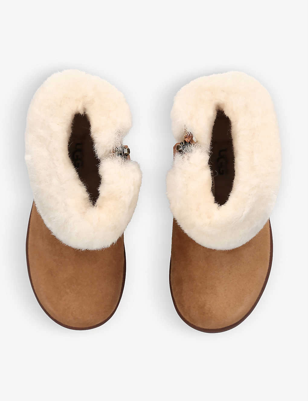 - Round closed to, stitched details, shearling trim at top, brand tab at heel, logo-embossed rubber zips