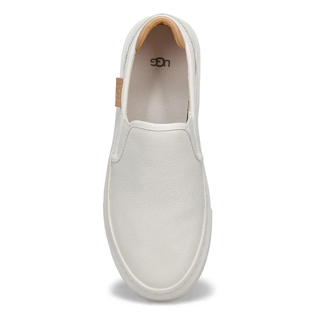 The Almaeda slip on in white is an understated sneaker made of rich premium leather. This timeless slip-on silhouette is lined in smooth cotton canvas for a barefoot feel. With the added cushioned foam footbed and durable rubber outsole, the Alameda will take you everywhere this season. This sneaker pairs with any outfit!