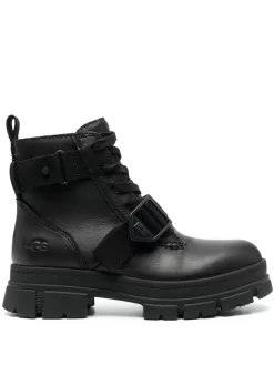 Ashton lace-up boots from UGG featuring black, calf leather, round toe, front lace-up fastening, front buckle fastening, side zip fastening, ridged rubber sole and 35mm heel.