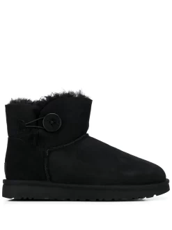 Black leather button fastened ankle boots from UGG featuring a slip-on style, a round toe, a side button fastening, stitched panels, a flat rubber sole and a shearling lining.