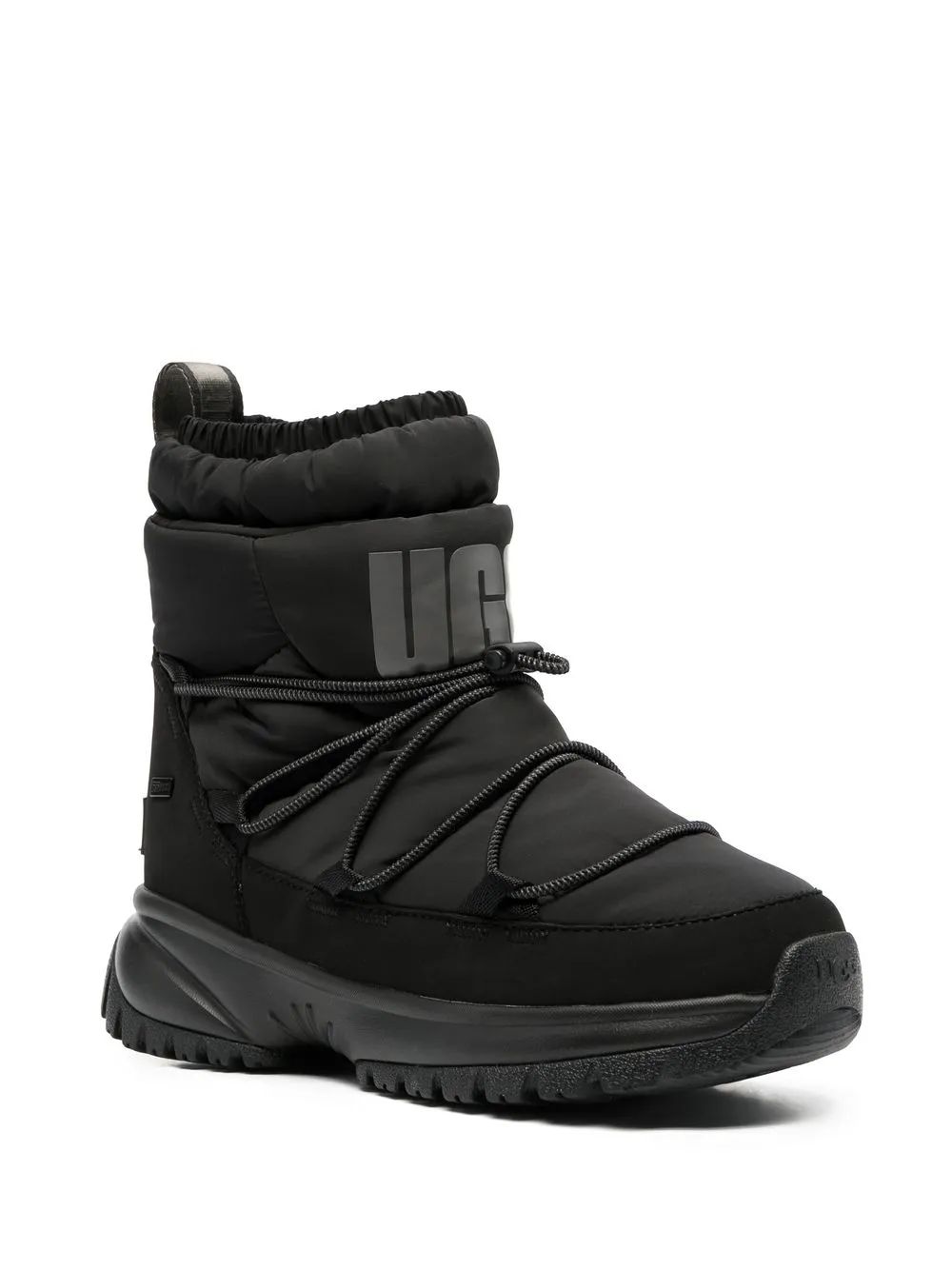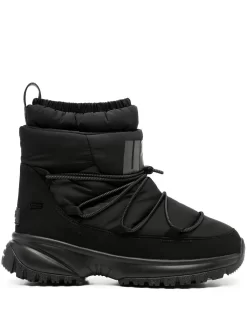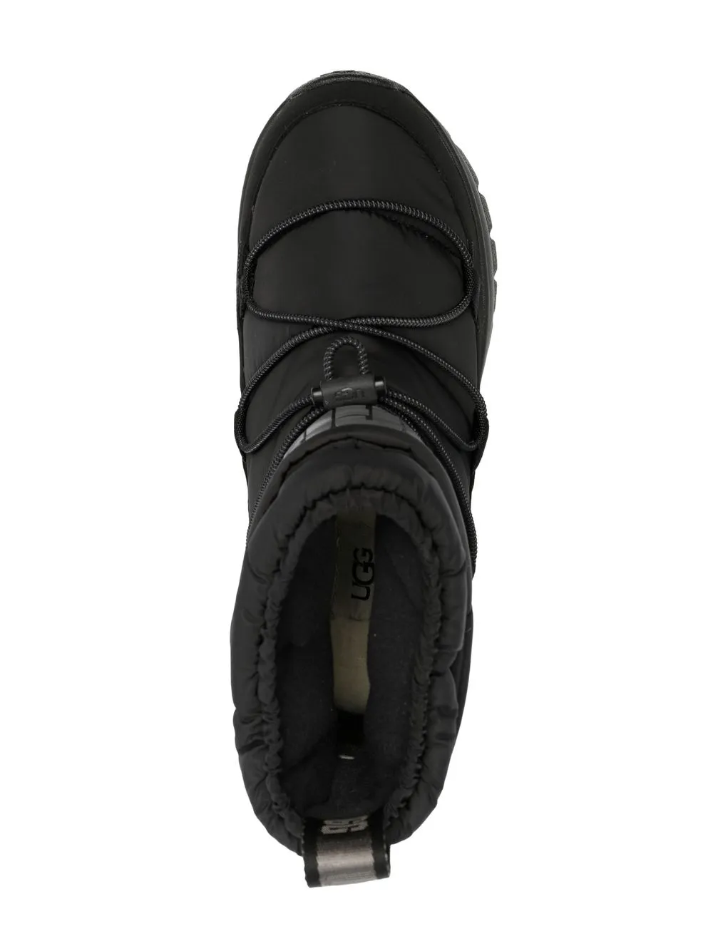 drawstring-fastening snow boots from UGG featuring black, drawstring fastening, logo print to the front, rope detailing, logo patch to the rear, pull-tab at the heel, pull-on style, branded footbed and rubber sole.