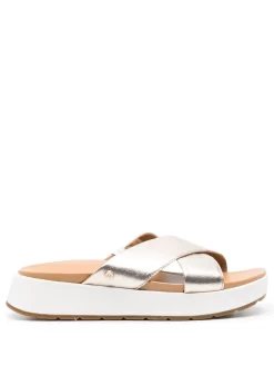 Emily cross-strap sandals from UGG featuring gold, leather, crossover strap at the toe, open toe and flatform sole.