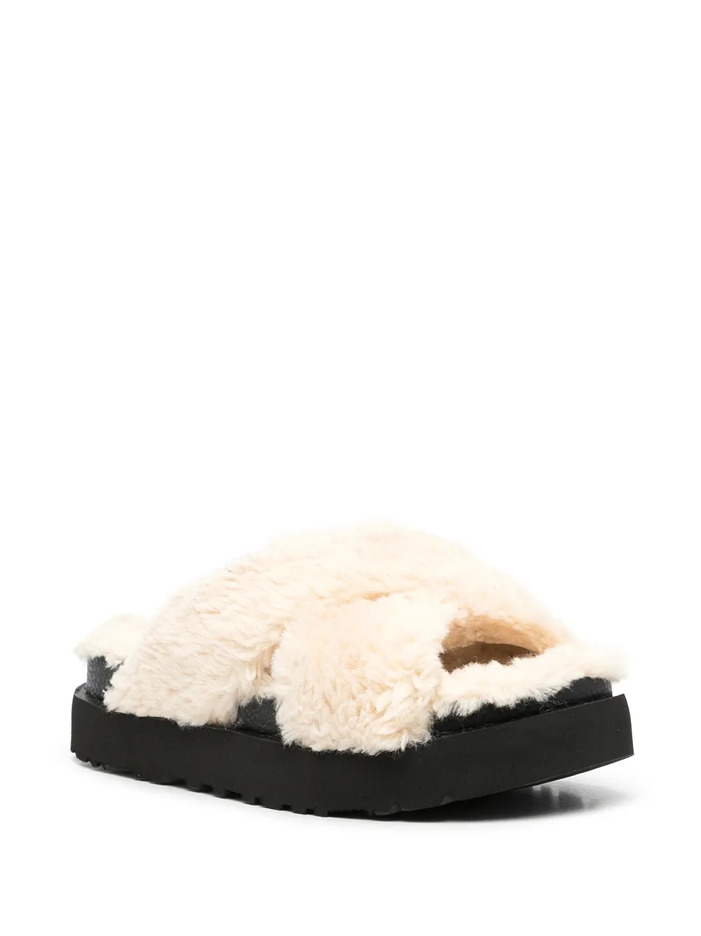 Beige/black cotton Fuzz Sugar cross slides from UGG featuring faux-shearling design, open toe, slip-on style, branded insole and flat rubber sole.