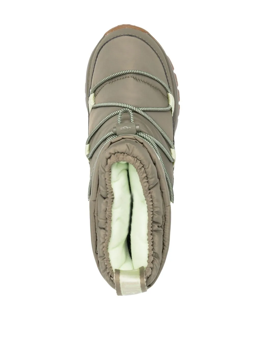 padded logo-print boots from UGG featuring olive green, padded design, logo print to the front, drawstring fastening, chunky rubber sole and round toe.